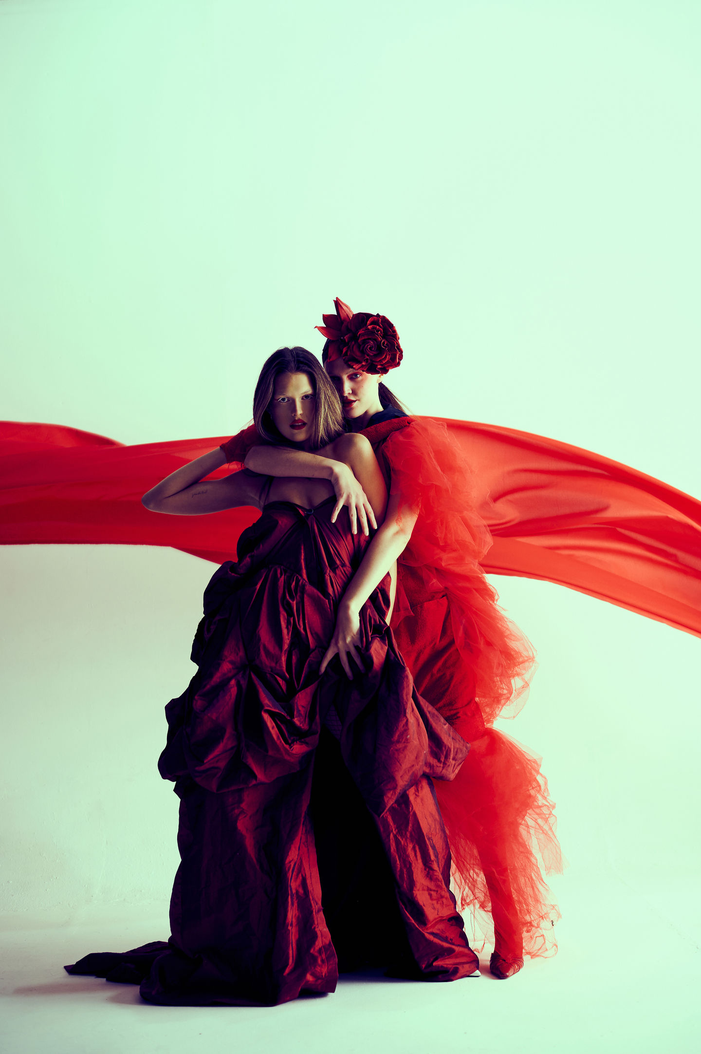 Wardrobe styling by Nat Betancourt and Darya Zakharova blurs the boundary between fashion and sculpture — voluminous silhouettes in tulle, lace, and satin become emotional armor. Every layer conceals as much as it reveals, amplifying the sense of mystery that runs through the series. The models’ gazes — one defiant, one knowing — feel like echoes of the same soul split into two divine expressions.